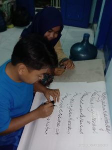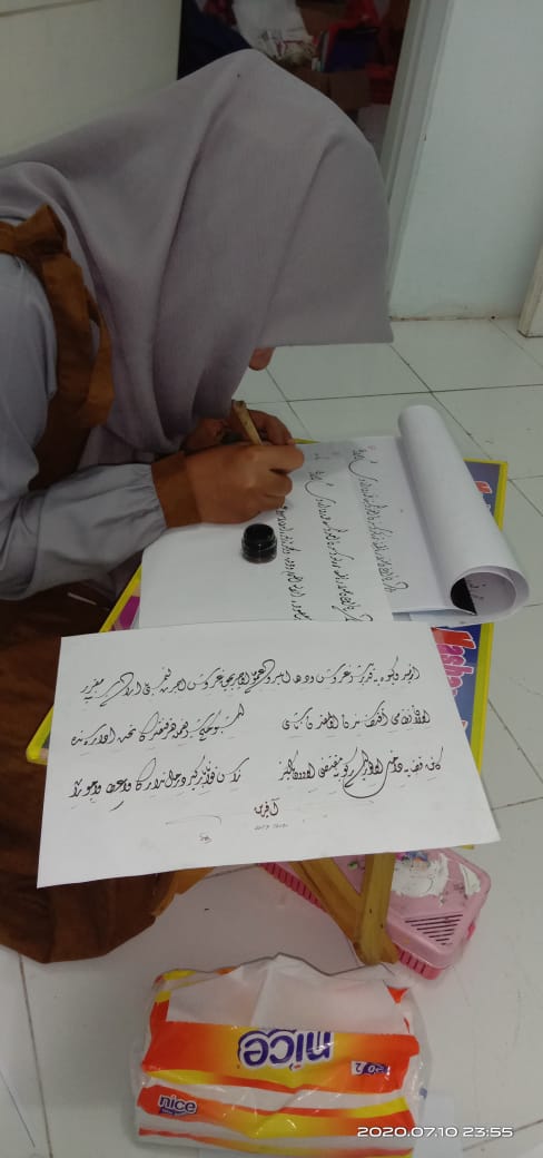 Ada yang latihan mengulang-ngulang dars, menulis setoran, merevisi dars, mengecat atau membuat pesanan karya, dan lain-lain. Tempat ini menjadi saksi perjuangan kami ber-kaligrafi-ria disela-sela kesibukan menjadi mahasiswa. Aku pribadi, mulai menekuni kaligrafi jenis diwani sejak 22 Januari 2020, yakni setelah resmi dinyatakan selesai dars khat riq’ah dengan menulis ijazah riq’ah.