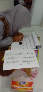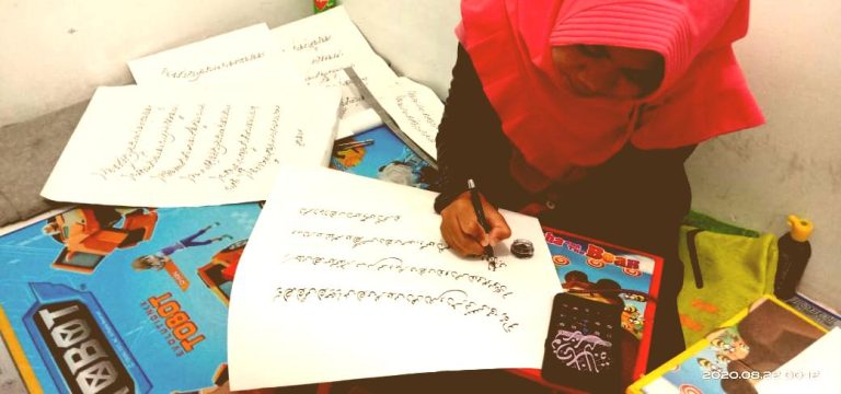 Aku hanya mengangguk. Ibu beranjak mengambil meja, handam, kertas, tinta dan peralatan lainnya. Ibu meletakkannya didepanku sembari menata posisi dudukku. Kucoba goreskan handamku dan menulis sedikit demi sedikit. kala itu darsku masih sampai huruf asasiyah izzat khat Diwani. Aku terus berlatih semampuku untuk menulis.